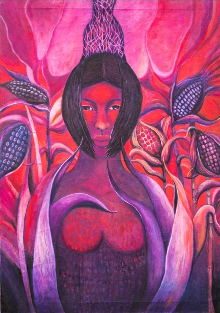 I continue to be inspired, to be filled with admiration and awed, by the abundance of feminine myths and tales that I have discovered about seeds, plants, and food, and by cultural and biological diversity itself. My paintings are not only a personal channel to express the intimate sense of nature that I deeply identify with, but also a bridge to communicate, transmit, and educate others about the message of traditional wisdom.
